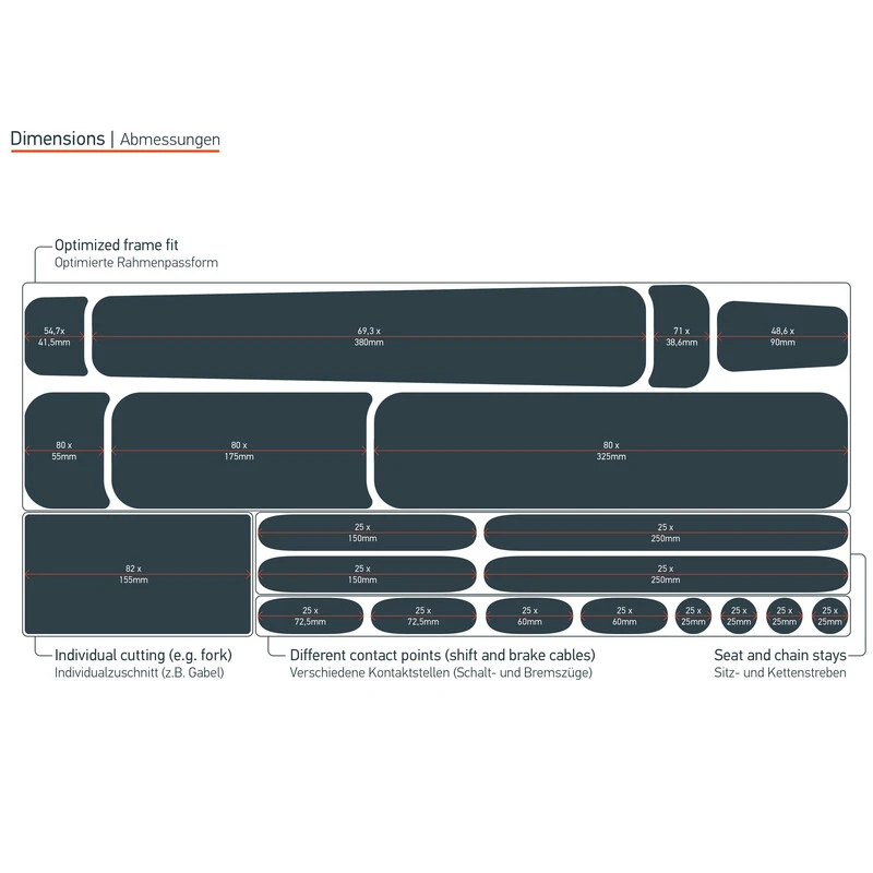 Durch das einfache Kombinationssystems können Sie die Aufkleber für viele gängige Rahmengrößen verwenden. Im Set enthalten ist zudem ein Auftragungs-Kit mit weicher Filzrakel, Mikrofasertuch & Reinigungs- sowie Montageflüssigkeit.
